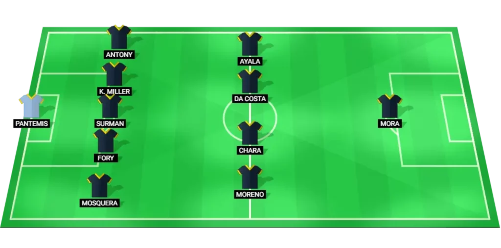 Portland’s lineup, bolstered by recent attacking success, is likely to include: Pantemis (GK), Mosquera (DF), Surman (DF), K. Miller (DF), Fory (DF), Antony (DF), Chara (MF), Ayala (MF), Moreno (MF), Da Costa (MF), Mora (FW).