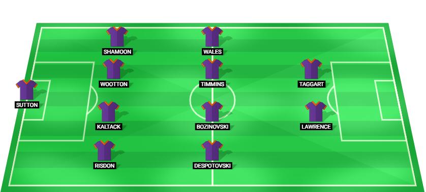 Sutton (GK), Risdon (DF), Kaltack (DF), Wootton (DF), Shamoon (DF), Despotovski (MF), Bozinovski (MF), Timmins (MF), Wales (MF), Lawrence (FW), Taggart (FW).