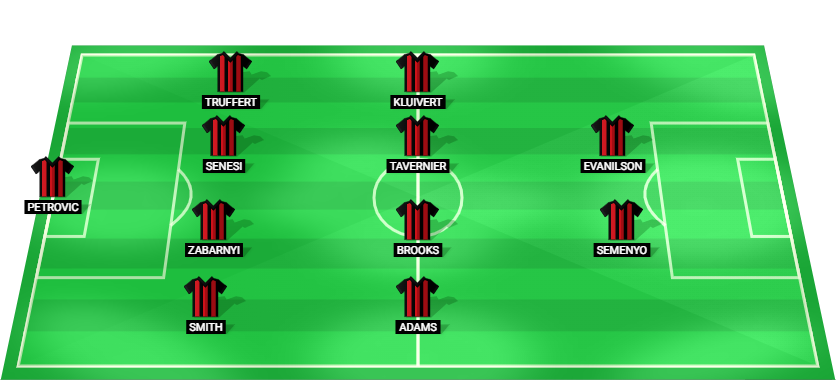 Petrovic (GK), Smith (DF), Zabarnyi (DF), Senesi (DF), Truffert (DF), Adams (MF), Brooks (MF), Tavernier (MF), Kluivert (MF), Semenyo (FW), Evanilson (FW).