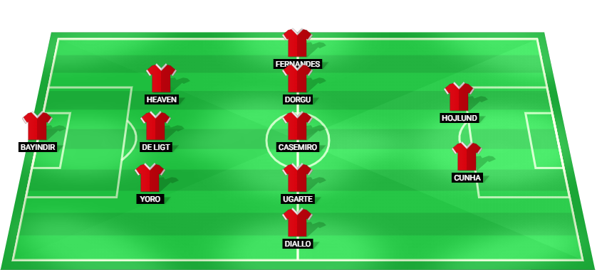 Bayindir (GK), Yoro (DF), de Ligt (DF), Heaven (DF), Diallo (MF), Ugarte (MF), Casemiro (MF), Dorgu (MF), Fernandes (MF), Cunha (FW), Hojlund (FW).