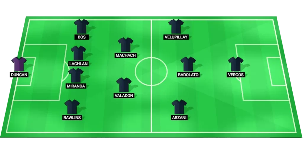 With key players like Nikos Vergos and Zinedine Machach in form, Melbourne Victory are likely to field a strong 4-2-3-1 formation: Duncan (GK), Rawlins (DF), Miranda (DF), Lachlan (DF), Bos (DF), Valadon (MF), Machach (MF), Arzani (MF), Badolato (MF), Velupillay (MF), Vergos (FW).