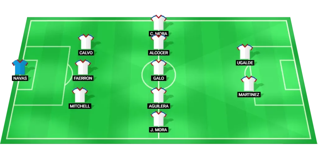 Costa Rica (3‑5‑2): Navas (GK), Mitchell (DF), Faerron (DF), Calvo (DF), J. Mora (MF), Aguilera (MF), Galo (MF), Alcocer (MF), C. Mora (MF), Martinez (FW), Ugalde (FW)