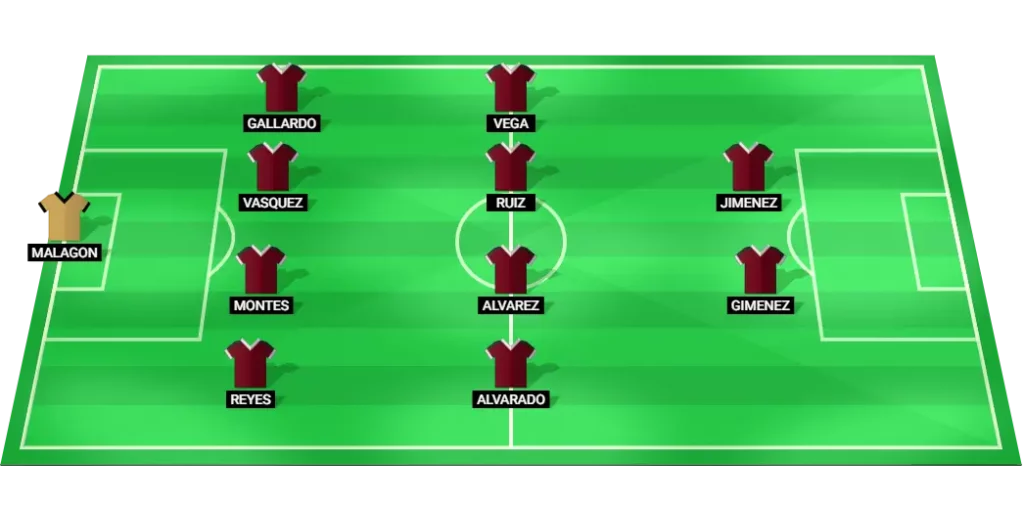 Mexico (4‑4‑2): Malagon (GK), Reyes (DF), Montes (DF), Vasquez (DF), Gallardo (DF), Alvarado (MF), Alvarez (MF), Ruiz (MF), Vega (MF), Gimenez (FW), Jimenez (FW)