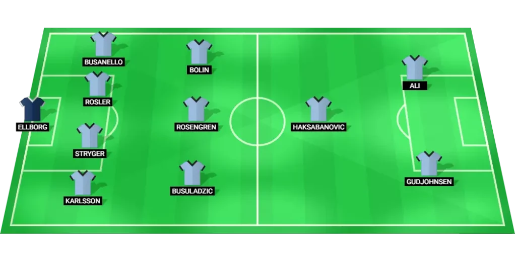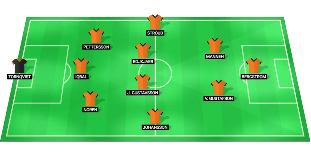 Mjallby AIF (3-4-2-1): Tornqvist (GK), Pettersson (DF), Noren (DF), Iqbal (DF), Johansson (MF), Gustavsson (MF), Rojkjaer (MF), Stroud (MF), Gustafson (FW), Bergstrom (FW), Manneh (FW)