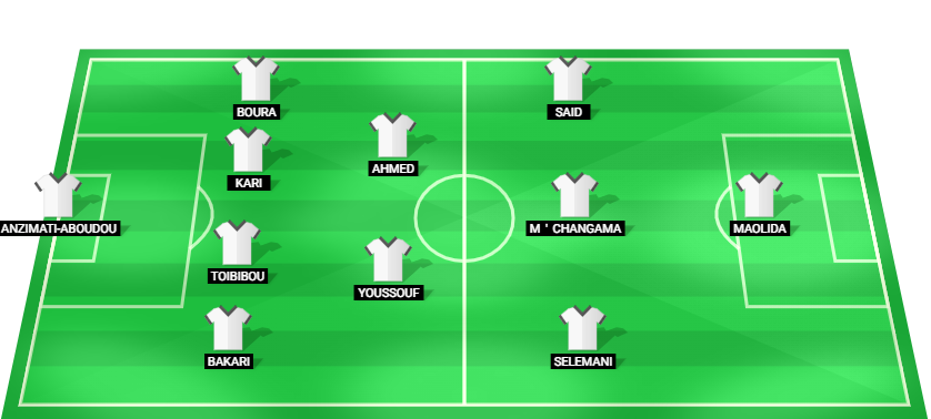 Anzimati-Aboudou (GK), Bakari (DF), Toibibou (DF), Kari (DF), Boura (DF), Youssouf (MF), Ahmed (MF), Selemani (AM), M’Changama (AM), Said (AM), Maolida (FW).