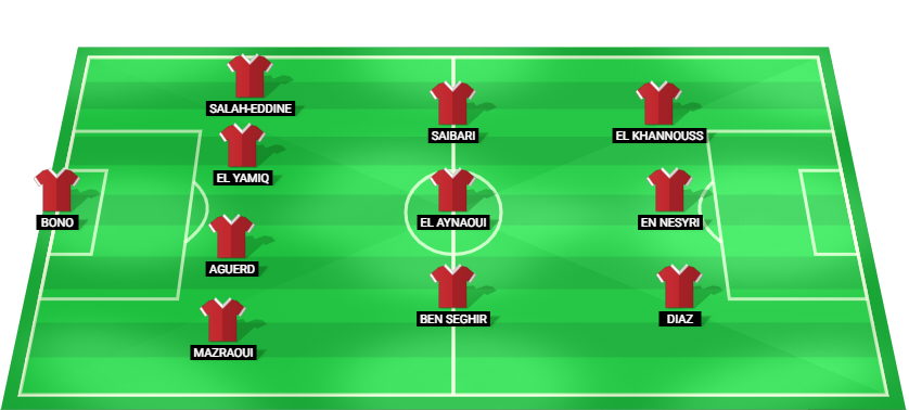 Bono (GK), Mazraoui (DF), Aguerd (DF), El Yamiq (DF), Salah-Eddine (DF), Ben Seghir (MF), El Aynaoui (MF), Saibari (MF), Diaz (FW), En Nesyri (FW), El Khannouss (FW).