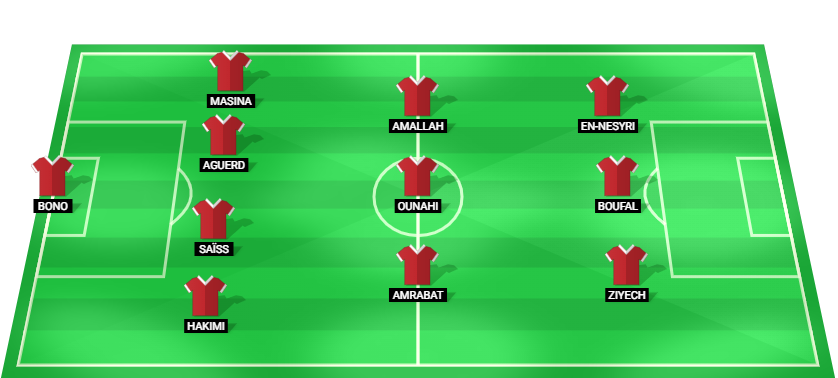 Bono (GK), Hakimi (DF), Saïss (DF), Aguerd (DF), Masina (DF), Amrabat (MF), Ounahi (MF), Amallah (MF), Ziyech (FW), Boufal (FW), En-Nesyri (FW).