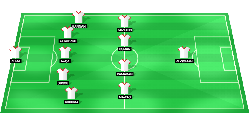 Alma (GK), Krouma (DF), Ousou (DF), Faqa (DF), Al Midani (DF), Hannan (DF), Mawas (MF), Ramadan (MF), Osman (MF), Kharbin (MF), Al-Somah (FW).