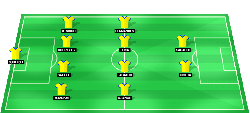 Sudeesh (GK), Yumnam (DF), Saheef (DF), Rodriguez (DF), Singh (DF), Singh (MF), Lagator (MF), Luna (MF), Fernandes (MF), Obieta (FW), Sadaoui (FW)