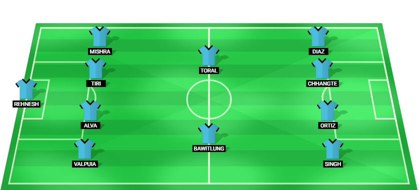 Rehnesh (GK), Valpuia (DF), Alva (DF), Tiri (DF), Mishra (DF), Bawitlung (MF), Toral (MF), Singh (FW), Ortiz (FW), Chhangte (FW), Diaz (FW)