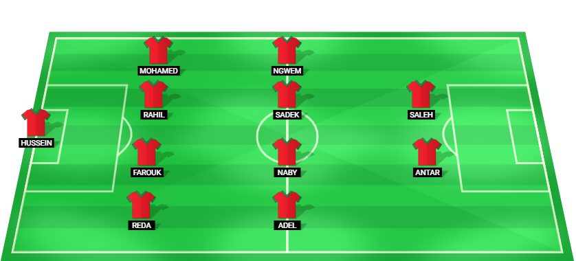 Hussein (GK), Reda (DF), Farouk (DF), Rahil (DF), Mohamed (DF), Adel (MF), Naby (MF), Sadek (MF), Ngwem (MF), Antar (FW), Saleh (FW).