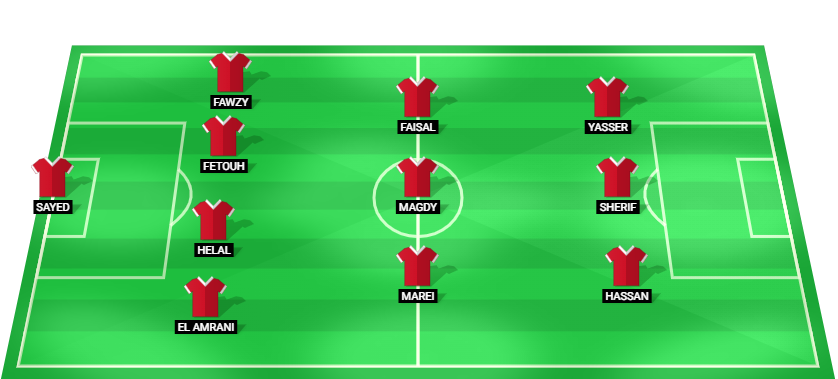 Sayed (GK), El Amrani (DF), Helal (DF), Fetouh (DF), Fawzy (DF), Marei (MF), Magdy (MF), Faisal (MF), Hassan (FW), Sherif (FW), Yasser (FW).