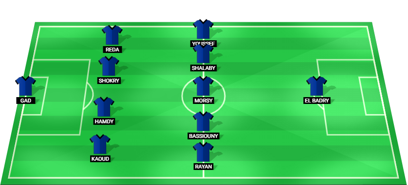 Gad (GK), Kaoud (DF), Hamdy (DF), Shokry (DF), Reda (DF), Rayan (MF), Bassiouny (MF), Morsy (MF), Shalaby (FW), Youssef (FW), El Badry (FW).