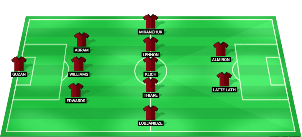 Guzan (GK), Edwards (DF), Williams (DF), Abram (DF), Lobjanidze (MF), Thiare (MF), Klich (MF), Lennon (MF), Miranchuk (MF), Latte Lath (FW), Almiron (FW)