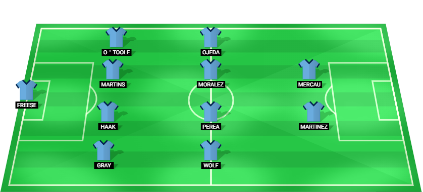 Freese (GK), Gray (DF), Haak (DF), Martins (DF), O’Toole (DF), Wolf (MF), Perea (MF), Moralez (MF), Ojeda (MF), Martinez (FW), Mercau (FW)