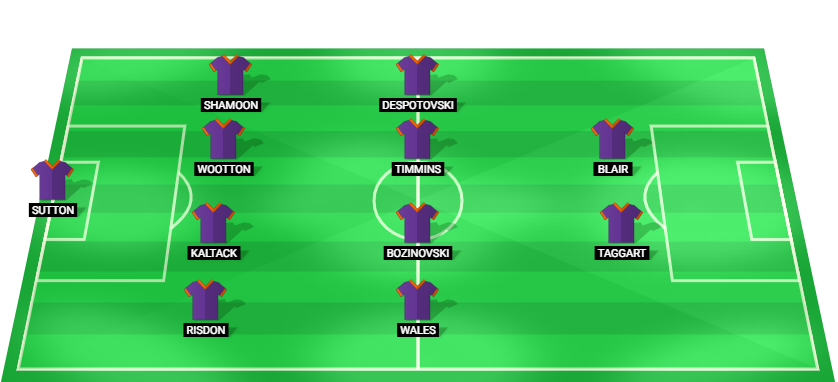 Sutton (GK), Risdon (DF), Kaltack (DF), Wootton (DF), Shamoon (DF), Wales (MF), Bozinovski (MF), Timmins (MF), Despotovski (MF), Taggart (FW), Blair (FW).