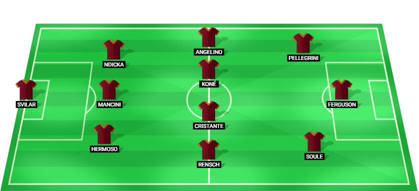 Svilar (GK), Hermoso (DF), Mancini (DF), Ndicka (DF), Rensch (MF), Cristante (MF), Kone (MF), Angelino (MF), Soule (AM), Pellegrini (AM), Ferguson (FW)