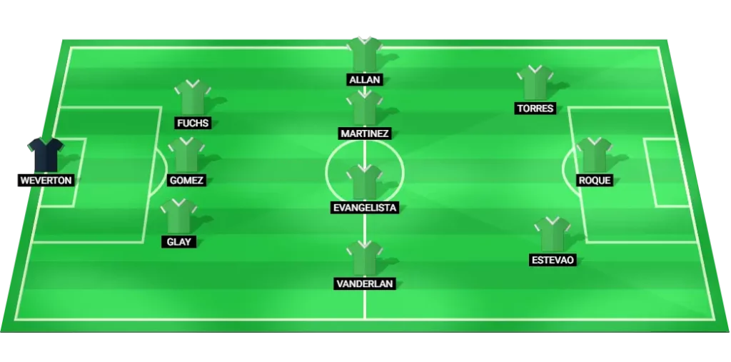 Palmeiras Predicted Lineup (3-4-3): Weverton (GK), Fuchs (DF), Gomez (DF), Glay (DF), Vanderlan (MF), Martinez (MF), Evangelista (MF), Allan (MF), Torres (FW), Roque (FW), Estevao (FW)