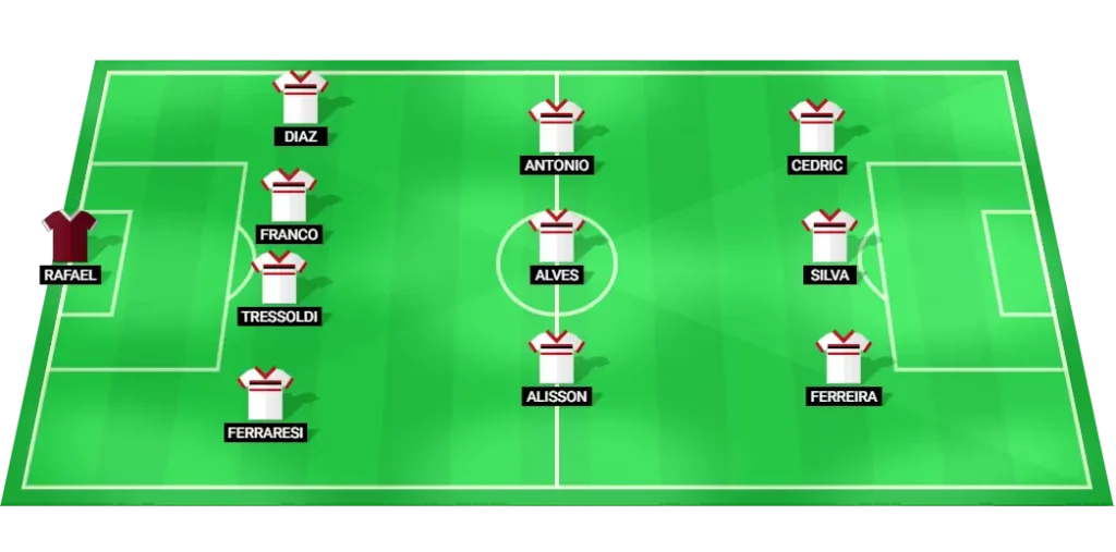 Sao Paulo Predicted Lineup (4-3-3): Rafael (GK), Diaz (DF), Franco (DF), Tressoldi (DF), Ferraresi (DF), Antonio (MF), Alves (MF), Alisson (MF), Ferreira (FW), Silva (FW), Cedric (FW)