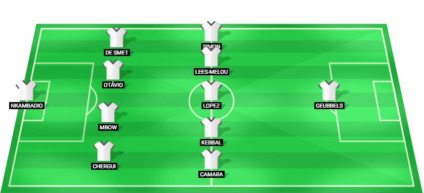 Nkambadio (GK), Chergui (DF), Mbow (DF), Otavio (DF), De Smet (DF), Camara (MF), Kebbal (MF), Lopez (MF), Lees-Melou (MF), Simon (MF), Geubbels (FW)