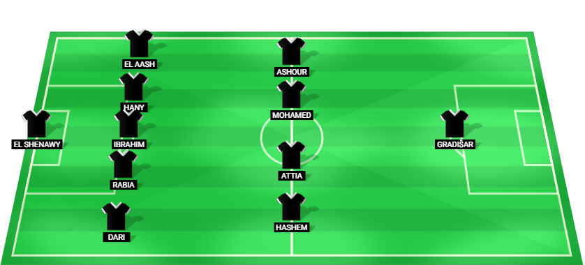 El-Shenawy (GK), Dari (DF), Rabia (DF), Ibrahim (DF), Hany (DF), El Aash (DF), Hashem (MF), Attia (MF), Mohamed (MF), Ashour (MF), Gradišar (FW)