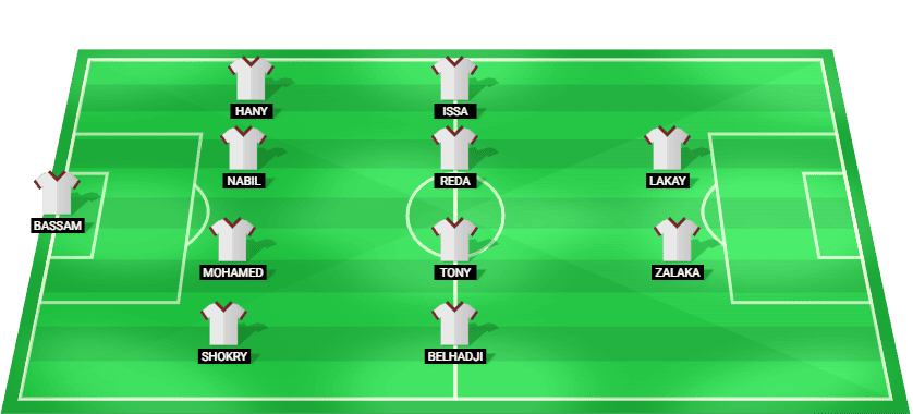 Bassam M. (GK), Shokry M. (DF), Mohamed A. R. (DF), Nabil R. (DF), Hany A. (DF), Belhadji A. (MF), Tony M. (MF), Reda M. (MF), Issa I. (MF), Zalaka M. (FW), Lakay F. (FW)