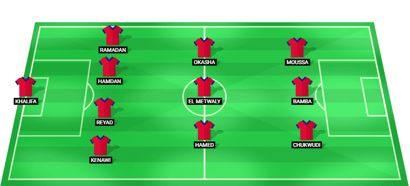 Khalifa M. (GK), Kenawi M. (DF), Reyad H. (DF), Hamdan H. (DF), Khaled Ramadan (DF), Hamed A. (MF), El Metwaly R. (MF), Okasha M. (MF), Chukwudi G. (FW), Bamba I. (FW), Moussa B. (FW)