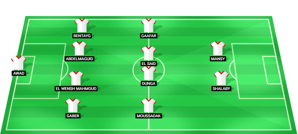 Awad M. (GK), Gaber O. (DF), El Wensh Mahmoud (DF), Abdelmaguid H. (DF), Bentayg M. (DF), Moussadak S. (MF), Dunga N. (MF), El Said A. (MF), Farouk Gaafar S. (MF), Shalaby M. (FW), Mansy N. (FW)