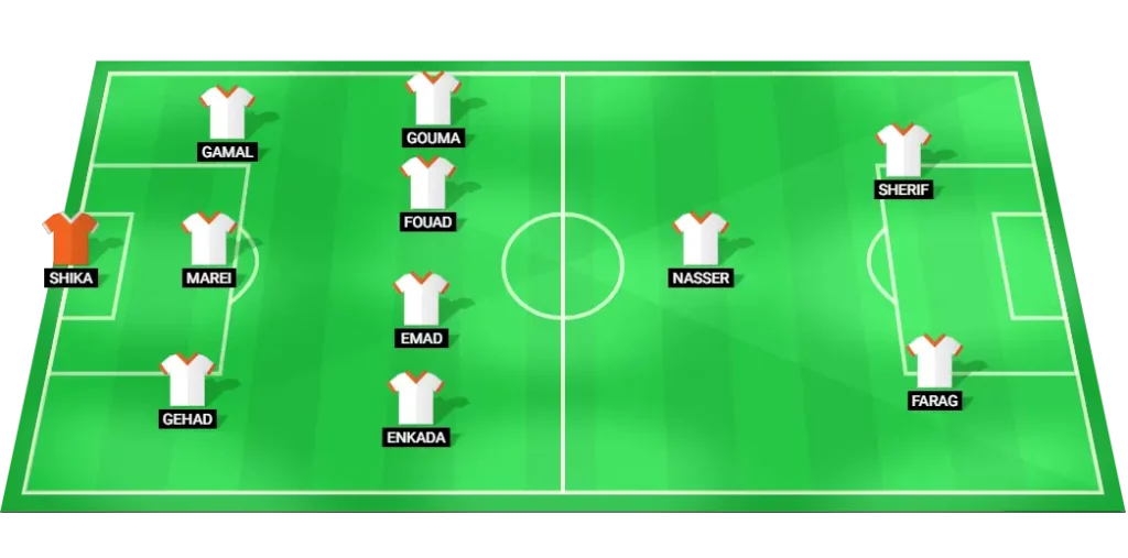 Pharco Predicted Lineup: Shika (GK), Gamal (DF), Marei (DF), Gehad (DF), Gouma (MF), Enkada (MF), Emad (MF), Nasser (MF), Fouad (MF), Farag (FW), Sherif (FW)