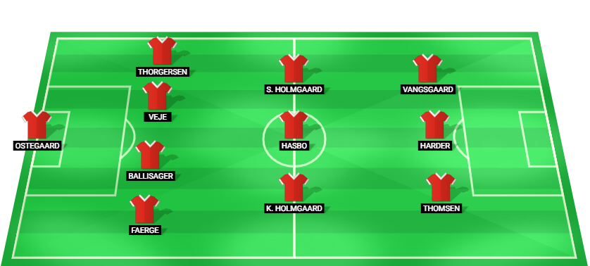 Ostegaard (GK), Faerge (DF), Ballisager (DF), Veje (DF), Thorgersen (DF), K. Holmgaard (MF), Hasbo (MF), S. Holmgaard (MF), Thomsen (FW), Harder (FW), Vangsgaard (FW).