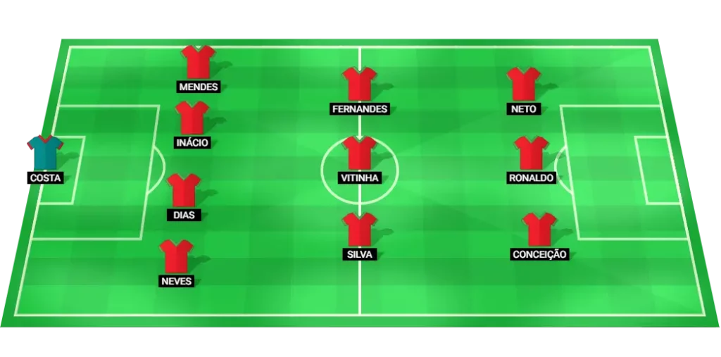 Portugal Predicted Lineup: D. Costa (GK), J. Neves (DF), R. Dias (DF), G. Inácio (DF), N. Mendes (DF), B. Silva (MF), Vitinha (MF), B. Fernandes (MF), F. Conceição (FW), C. Ronaldo (FW), P. Neto (FW)