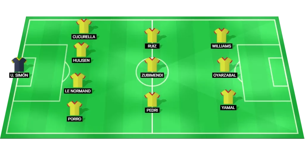 Spain Predicted Lineup: U. Simón (GK), P. Porro (DF), R. Le Normand (DF), D. Huijsen (DF), M. Cucurella (DF), Pedri (MF), M. Zubimendi (MF), F. Ruiz (MF), L. Yamal (FW), M. Oyarzabal (FW), N. Williams (FW)