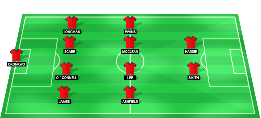 Okonkwo (GK), James (DF), O’Connell (DF), Scarr (DF), Longman (MF), Ashfield (MF), Lee (MF), McClean (MF), Evans (MF), Smith (FW), Hardie (FW)