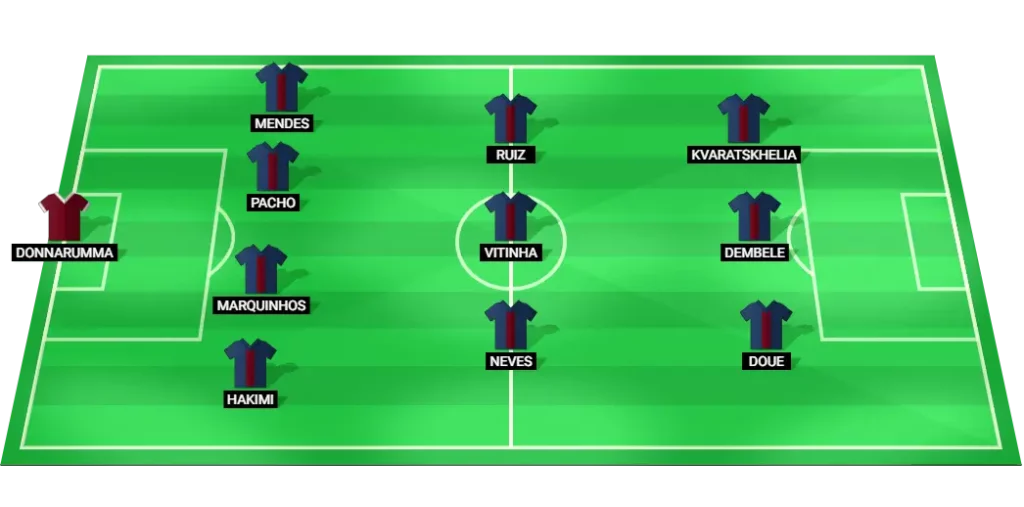 PSG predicted lineup (4-3-3): Donnarumma (GK), Hakimi (DF), Marquinhos (DF), Pacho (DF), Mendes (DF), Neves (MF), Vitinha (MF), Ruiz (MF), Doue (FW), Dembele (FW), Kvaratskhelia (FW)