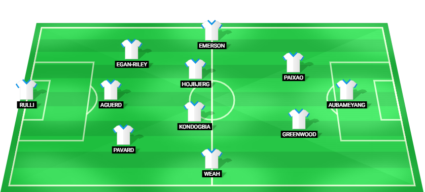 Rulli (GK), Pavard (DF), Aguerd (DF), Egan-Riley (DF), Weah (MF), Kondogbia (MF), Hojbjerg (MF), Emerson (MF), Greenwood (MF), Paixao (MF), Aubameyang (FW)