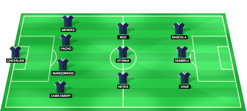 Chevalier (GK), Zaire-Emery (DF), Marquinhos (DF), Pacho (DF), Mendes (DF), Neves (MF), Vitinha (MF), Ruiz (MF), Doue (FW), Dembele (FW), Barcola (FW)