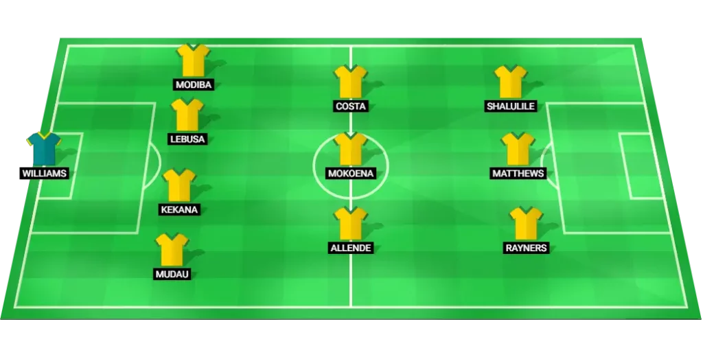 Mamelodi Sundowns Predicted Lineup: Williams (GK), Mudau (DF), Kekana (DF), Lebusa (DF), Modiba (DF), Allende (MF), Mokoena (MF), Costa (MF), Rayners (FW), Matthews (FW), Shalulile (FW)