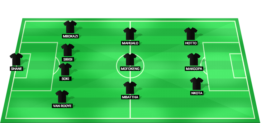 Shane (GK), van Rooyen (DF), Soki (DF), Sibisi (DF), Mbokazi (DF), Mbattha (MF), Mofokeng (MF), Mahualo (MF), Nkota (FW), Makgopa (FW), Hotto (FW).