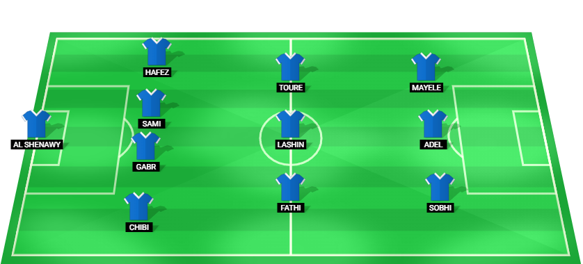 Al Shenawy (GK), Chibi (DF), Gabr (DF), Sami (DF), Hafez (DF), Fathi (MF), Lashin (MF), Toure (MF), Sobhi (FW), Adel (FW), Mayele (FW).