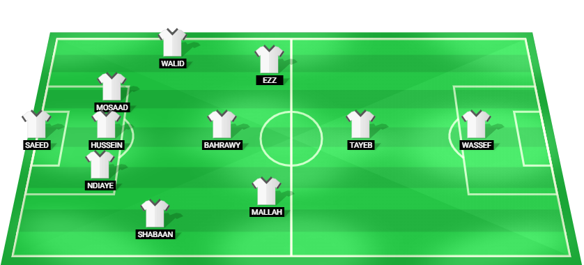Saeed (GK), Shabaan (DF), Ndiaye (DF), Hussein (DF), Mosaad (DF), Walid (DF), Mallah (MF), Bahrawy (MF), Ezz (MF), Tayeb (AM), Wassef (FW)