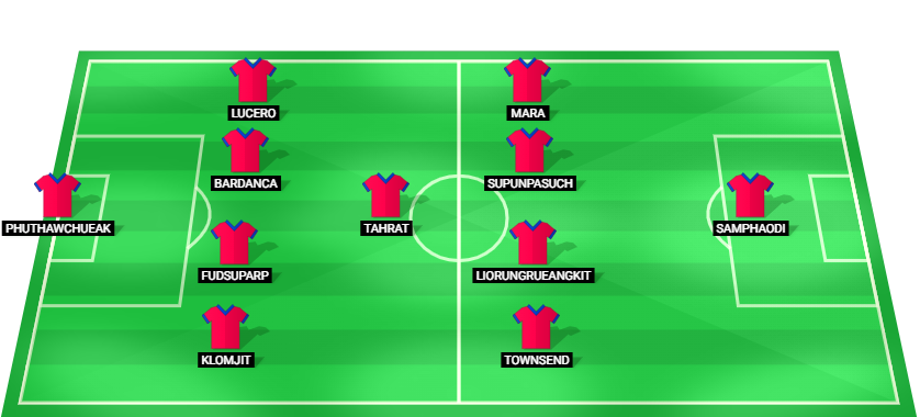 Phuthawchueak (GK), Klomjit (DF), Fudsuparp (DF), Bardanca (DF), Lucero (DF), Tahrat (MF), Townsend (MF), Liorungrueangkit (MF), Supunpasuch (MF), Mara (MF), Samphaodi (FW).