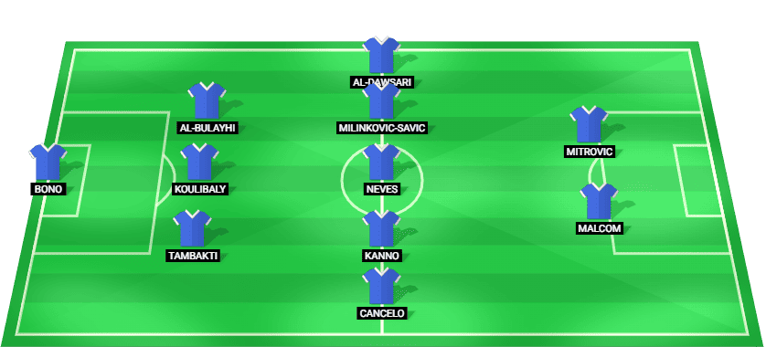 Bono (GK), Tambakti (DF), Koulibaly (DF), Al-Bulayhi (DF), Cancelo (MF), Kanno (MF), Neves (MF), Milinkovic-Savic (MF), Al-Dawsari (MF), Malcolm (FW), Mitrovic (FW)