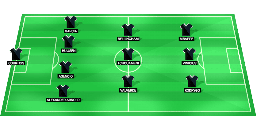 Courtois (GK), Alexander-Arnold (DF), Asencio (DF), Huijsen (DF), Garcia (DF), Valverde (MF), Tchouameni (MF), Bellingham (MF), Rodrygo (FW), Vinicius (FW), Mbappe (FW)