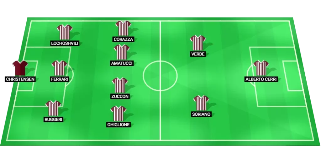 Salernitana may opt for a 3-4-2-1 system, balancing attack and defense. Oliver Christensen (GK), Fabio Ruggeri (DF), Gianmarco Ferrari (DF), Luka Lochoshvili (DF), Paolo Ghiglione (MF), Federico Zuccon (MF), Lorenzo Amatucci (MF), Tommaso Corazza (MF), Roberto Soriano (AM), Daniele Verde (AM), Alberto Cerri (FW).