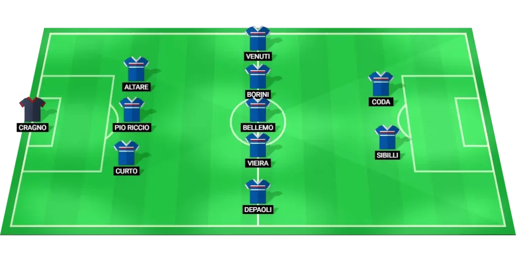 Sampdoria are expected to deploy a 3-5-2 formation, focusing on defensive stability and wing play. Alessio Cragno (GK), Marco Curto (DF), A. Pio Riccio (DF), Giorgio Altare (DF), Fabio Depaoli (MF), Ronaldo Vieira (MF), Alessandro Bellemo (MF), Fabio Borini (MF), Lorenzo Venuti (MF), Giuseppe Sibilli (FW), Massimo Coda (FW).