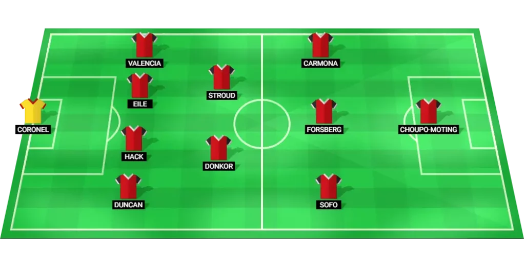 New York is likely to deploy their 4-2-3-1 setup, with an emphasis on attacking through Choupo-Moting: Coronel (GK), Duncan (DF), Hack (DF), Eile (DF), Valencia (DF), Donkor (MF), Stroud (MF), Sofo (MF), Forsberg (MF), Carmona (MF), Choupo-Moting (FW).