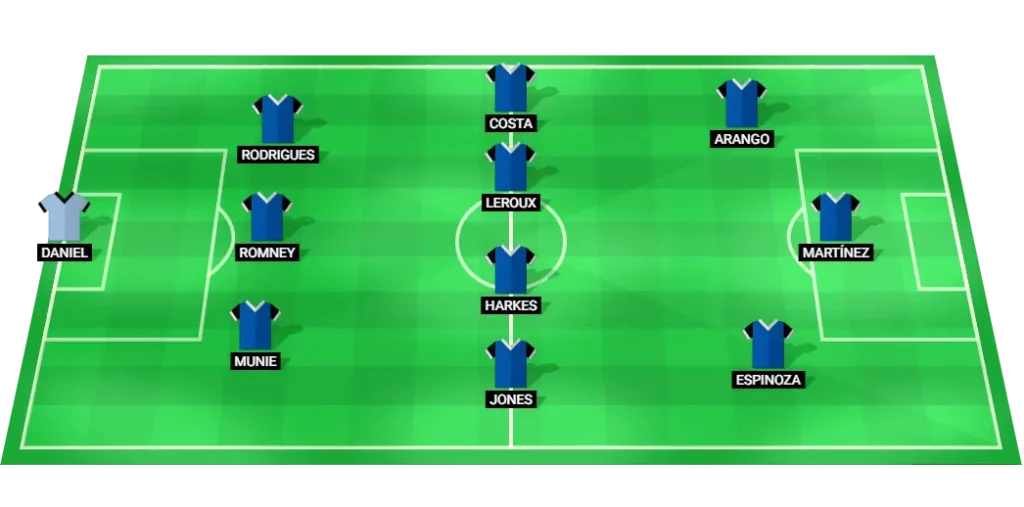 San Jose is expected to stick with their attacking 3-4-3 formation, relying on home support to push for goals: Daniel (GK), Munie (DF), Romney (DF), Rodrigues (DF), Jones (MF), Harkes (MF), Leroux (MF), Costa (MF), Espinoza (FW), Martínez (FW), Arango (FW).