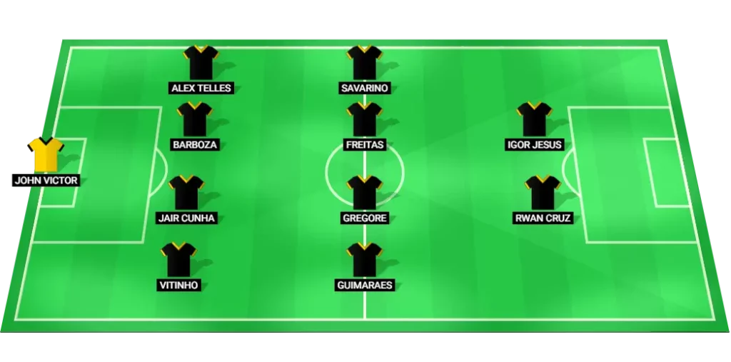 Botafogo RJ Predicted Lineup: John Victor (GK), Vitinho (DF), Jair Cunha (DF), Alexander Barboza (DF), Alex Telles (DF), Artur Guimaraes (MF), Gregore (MF), Marlon Freitas (MF), Jefferson Savarino (MF), Rwan Cruz (FW), Igor Jesus (FW)
