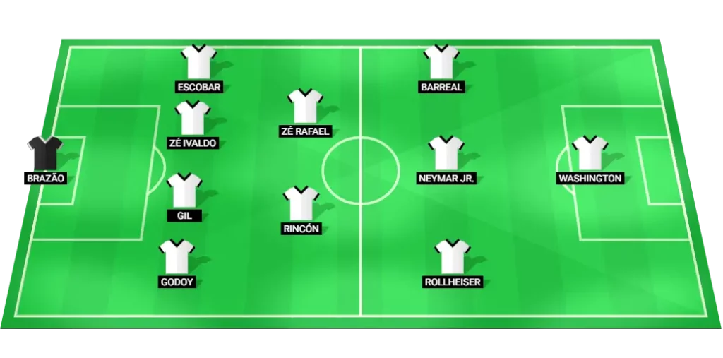 Santos FC Predicted Lineup: Gabriel Brazão (GK), Leonardo Godoy (DF), Gil (DF), Zé Ivaldo (DF), Gonzalo Escobar (DF), Tomás Rincón (MF), Zé Rafael (MF), Benjamin Rollheiser (MF), Álvaro Barreal (MF), Neymar Jr. (MF), Deivid Washington (FW)