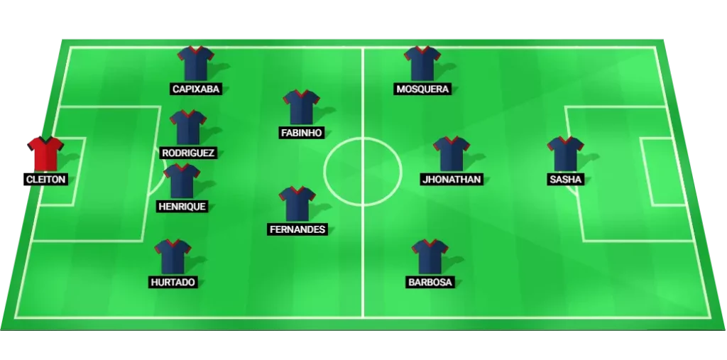 Red Bull Bragantino Predicted Lineup (4-2-3-1): Cleiton (GK), Hurtado (DF), Henrique (DF), Rodriguez (DF), Capixaba (DF), Fernandes (MF), Fabinho (MF), Barbosa (MF), Jhonathan (MF), Mosquera (MF), Sasha (FW)